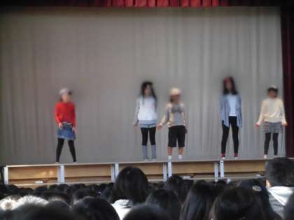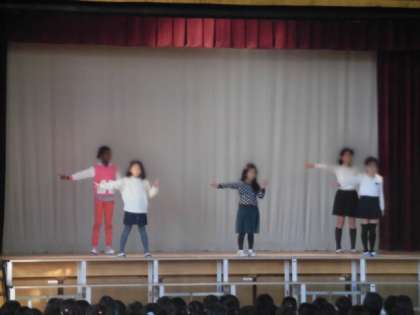 今朝の集会では、ダンスクラブの児童が、3グループに分かれて練習してきたダンスを発表しました。3学期に入ってからの数回のクラブ活動でフォーメーションや振付を考えてきましたが、満足のいく踊りができて、しかも見ていた児童からの温かい拍手を聞いて嬉しそうでした。フィナーレは、全校児童とともに「恋ダンス」をしました。