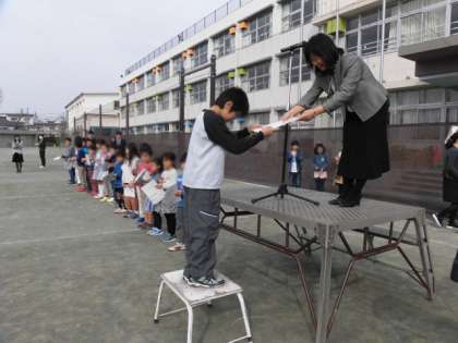 校長先生から各学級の児童代表に修了証が手渡されました。しっかりとした態度で受け取ることができました。