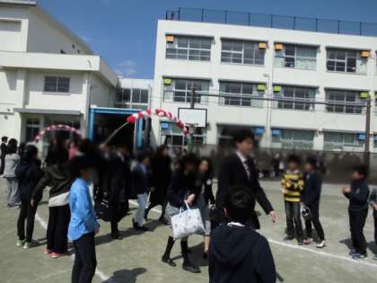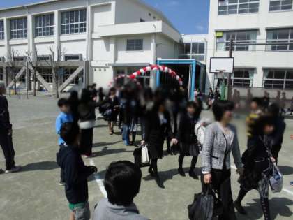 本校では、卒業生と保護者が手を繋いで小学校を去っていきます。