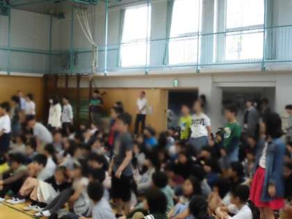 体育館のステージに各委員会の委員長が並び、順番に委員会名と委員会活動の概要を発表します。