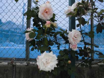 プールの横に、白いバラが咲いています。