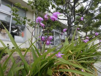 職員室前は、紫蘭がかわいらしい花を咲かせています。