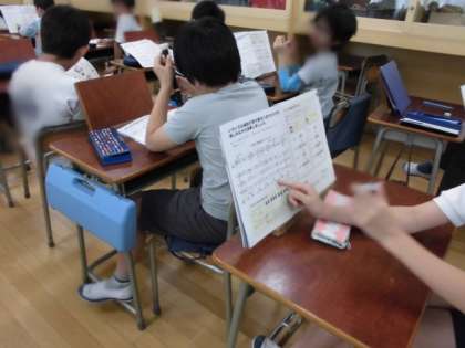 音楽は、楽譜を見ながら音の重なりを学習しました。(1組)