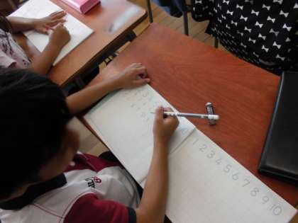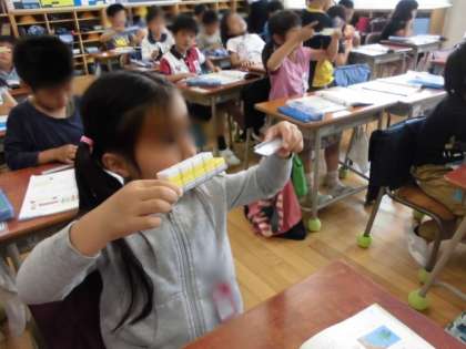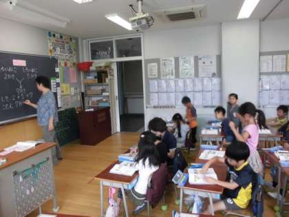 1年生は、算数ブロックを使って「たし算」を学習しています。