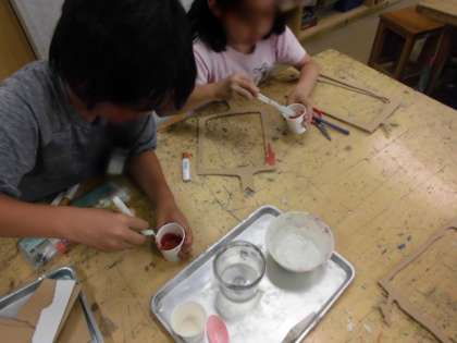 珪藻土、水、水彩絵の具を混ぜて、オリジナルの塗料を作りました。