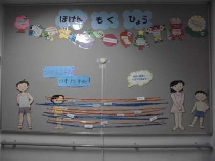 保健室前には、1学期の各学年の男女別平均身長が掲示されています。
