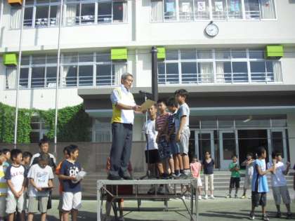 全校朝会で、夏にがんばった子どもたちの表彰をしました。野球に・ミニバス・いかだ下りとそれぞれに自分の力を十分に発揮しました。これから自分の力を高めてください。
