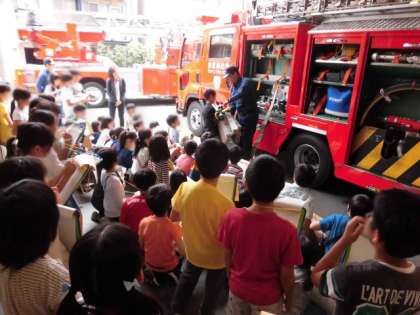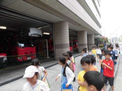 社会科の学習として、玉川消防署に見学に行きました。消防車の設備や消防士の装備を見せていただき、消防署の働きを深く学びました。