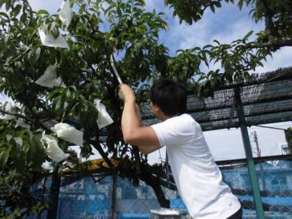 木の背がとても高く、脚立を使って届く範囲でしか摘果は行えていません。