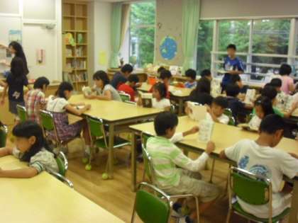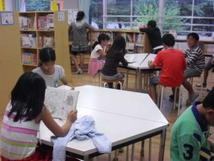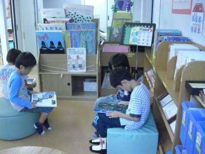 雨の日の休み時間は、図書館・絵本室で読書をする子どもたちがいっぱいいます。低学年は、絵本室で本読みをしている子が多いです。