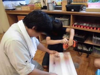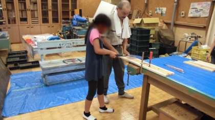 大工さんに教えていただき、本格的な木工作に取り組みました。花壇のプレートと収納ボックスを作ります。