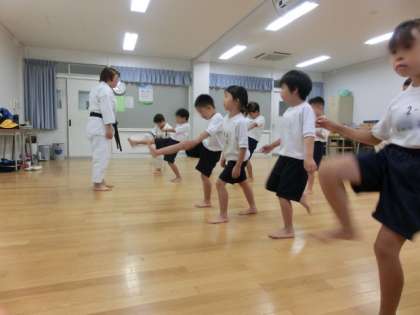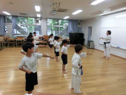 1年生から3年生まで15名で、合気道に挑戦しました。およそ1時間で、「突き」、「受け」、「蹴り」などの基本的な技を練習しました。ほかの武道やスポーツとは、違う体の使い方をすることが分かりました。例えば、「蹴り」は、サッカーの蹴り方とは違い、膝を上げてから蹴り出します。姿勢や礼など、相手を敬う心も学びました。