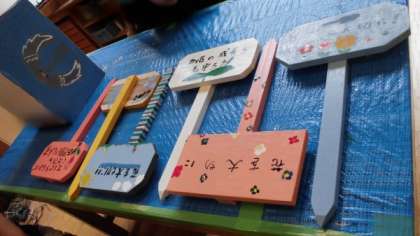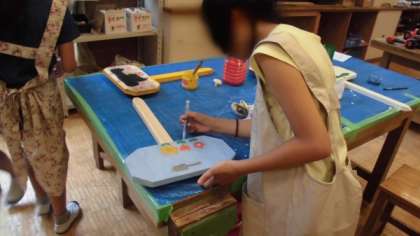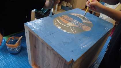 組み立てた物にペンキで色をつけて、みんなの作品が完成しました。