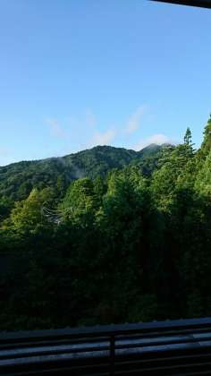 おはようございます。起床の時間の放送がはいりました。日光の朝は晴天です。ホテルからの外の風景です。本日もよろしくお願いいたします。