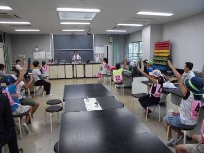 今年の生きもの探しのテーマは、「セミ」です。みんなが知っているセミの種類を発表しました。この地域によくいるセミは、アブラゼミ、ミンミンゼミ、ヒグラシ、ニイニイゼミ、ツクツクボウシ、クマゼミ等です。さあ、どんなセミが見付けられるか楽しみです。