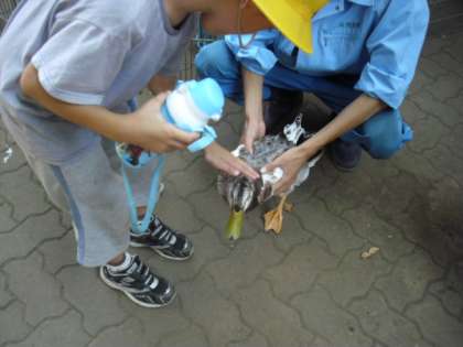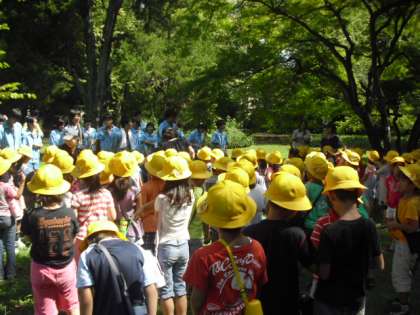 1年生は、校外学習で都立園芸高校に伺いました。園芸高校の敷地は広く、たくさんの木々があります。今日も暑い日でしたが、園芸高校の校門をくぐると涼しい風が吹いていました。このなかで、1年生は、高校3年生から動物の紹介をしてもらいました。ブタ、アヒル、モルモット、イヌ、ハト、ニワトリなどをケージ中で抱かせてもらいました。まるで「ふれあい動物園です」子どもたちも大喜びでした。