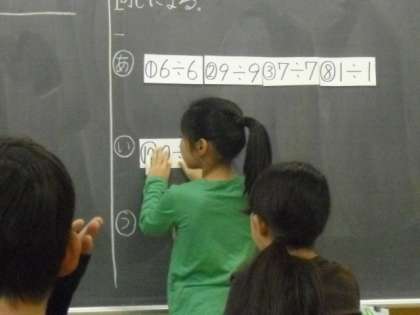 3年生の少人数算数の様子です。わり算について学習しています。次の時間からは、もうちょっと難しくなります。わり算の基礎をしっかりと学んでいます。