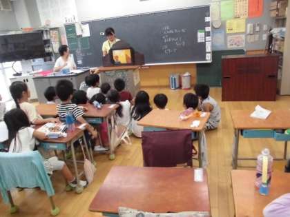 写真は、実習期間中に過ごした1年1組での紙芝居の様子です。