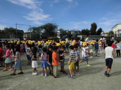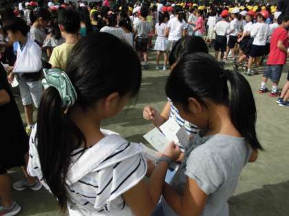 ひらがな1文字が記されたカードを1人2枚持ち、他の児童のカードと組み合わせて言葉を作ります。