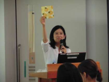 ワークショップでは、千代紙を使ったぽち袋づくりなどを教えていただきました。