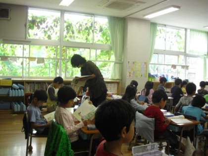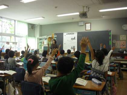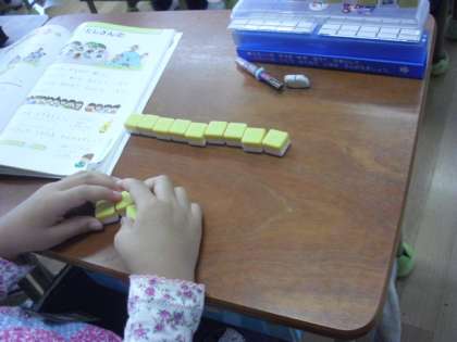 2時間目は1年生の算数です。たしざんの学習をします。1年生は意欲的で一生懸命に手を挙げて答えます。ブロックを使っても学習を進めます。
