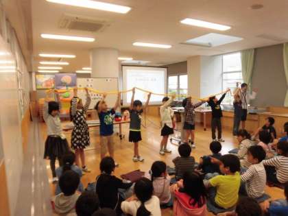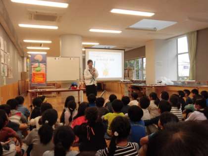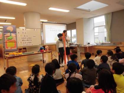 3年生を対象に「おなか元気教室」が行われました。食べ物の通り道のお話や、おなかにはたくさんの菌がすんでいるというお話を聞きました。「小腸の長さが6m」というお話にはびっくりした様子でした。これからも健康に気をつけて生活していきましょう。東京ヤクルト販売株式会社の皆様、本日はありがとうございました。