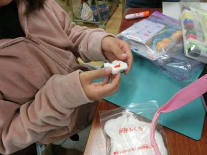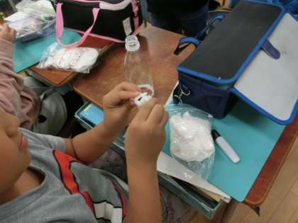 ペットボトルの底を切り取り、紙粘土に色をつけて飾り付けします。