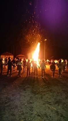 キャンプファイヤー、みんなで和仁なり、歌を歌っています。