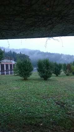 おはようございます。起床の時間になりました。7時より朝会になります。川場村の朝の天気は雨です。写真は宿舎の内から外を見た様子です。本日もよろしくお願いいたします