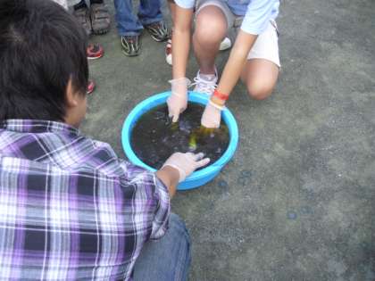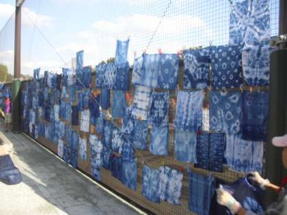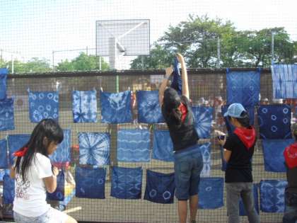 今日最初のイベントは、「藍染」です。白いハンカチに輪ゴムを巻いたり割り箸をつけてりして、絞り染めをしました。出来上がった作品は校庭のネットにかけて干します。