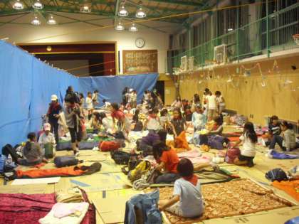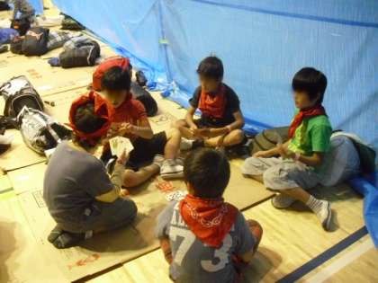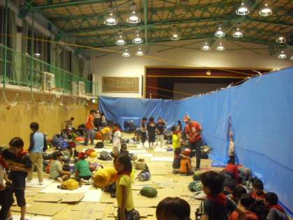 今日の泊まりは、体育館です。ブルーシートで男の子の部屋と女の子の部屋に分かれています。部屋では友達とお楽しく遊んでいます。