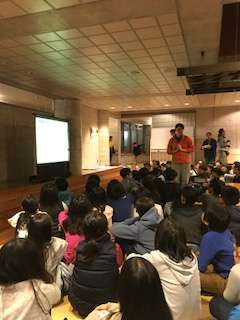 雨天のため、ナイトハイクツアーは中止です。室内クラフトについて説明を受けています。「林業ってなあに?」というスライドショーを見ています。