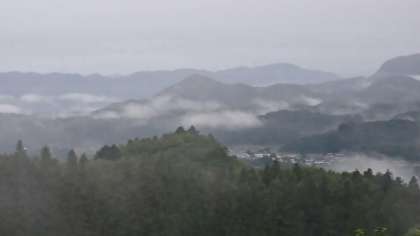 写真は、宿舎前の駐車場前からとった朝の川場村の景色です。雲海が見えます。