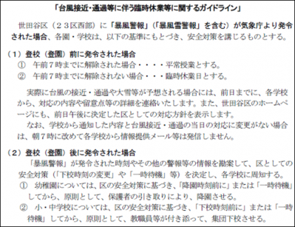 配布文書に、本日配布した世田谷区教育員会による「台風接近・通過等に伴う臨時休業等に関するガイドラインについて」を貼りつけました。