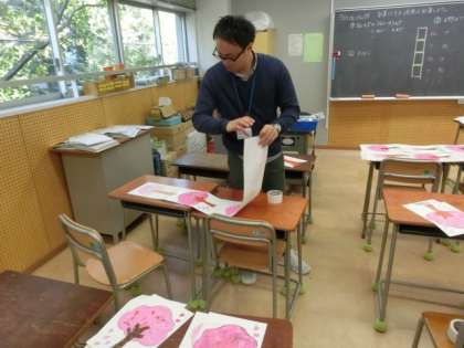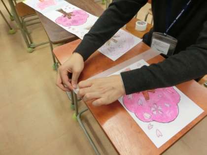 養生テープで、児童の作品をつなぎます。