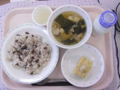 10月3日の開校記念日をお祝いしてのお赤飯です。今日は学校の2日遅れのお誕生日パーティーというところです。来年は開校記念日が月曜日ですから、開校記念日にお赤飯が食べたいですね。