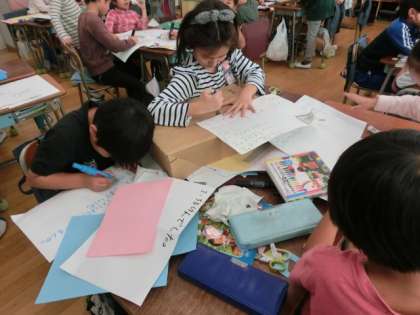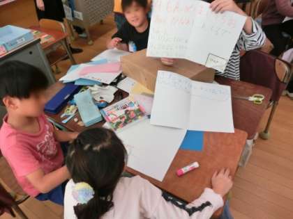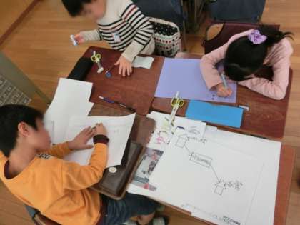 こちらは、町たんけんの発表会に向けて、グループで準備をしています。