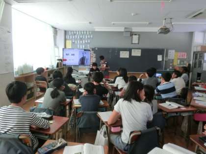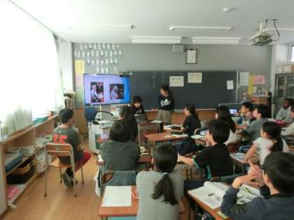 パワーポイントを使って、調べ学習の発表を行っています。