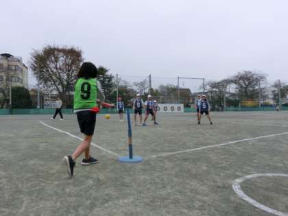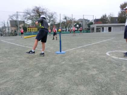 ティースタンドを使用し、ベースボール型のゲームに取り組んでいる様子です。