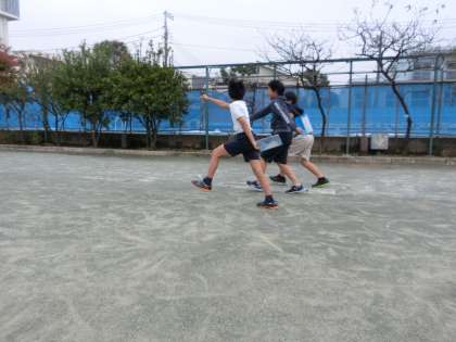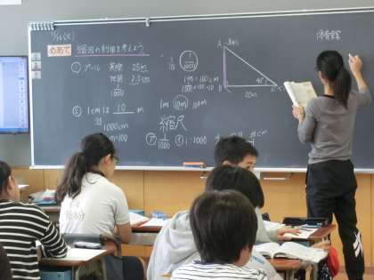 縮図の学習のために、実際に校庭を歩いて体感しました。