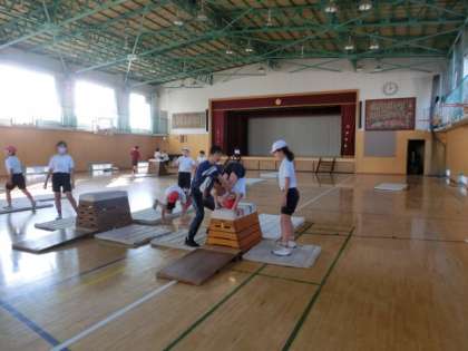 台上前転の練習には、補助が付きます。