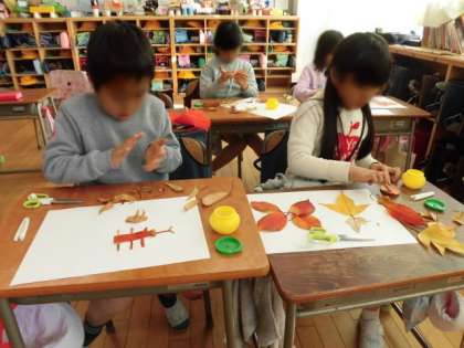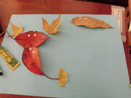 1年生の生活科で、拾った落ち葉を使って生きものをつくりました。