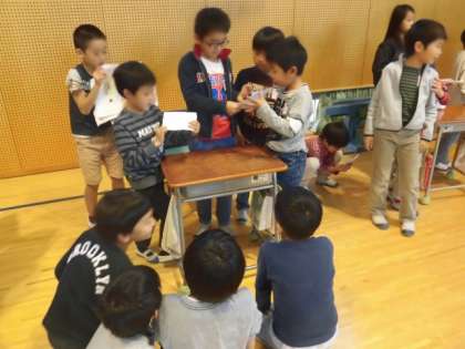 2年生が発表をして、1年生が発表を聞いて回ります。