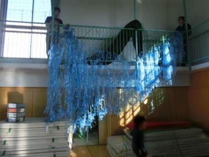 川の出来栄えを確認するため、体育館のギャラリーからつってみました。