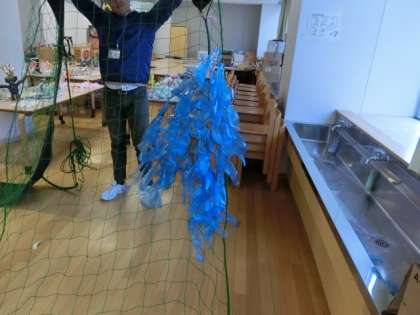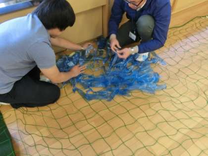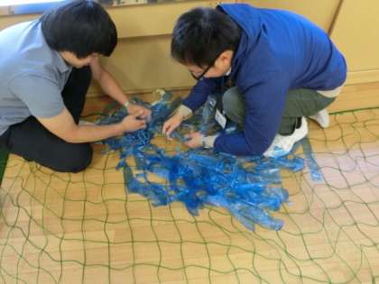 網目の上のひもに、30cmのテープを3本縛り付けていきます。