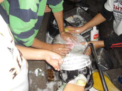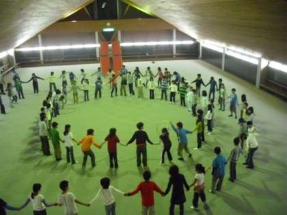 飯盒炊飯の片づけを終えて、夜のお楽しみです。外は残念ながら雨が降ってきました。「村の会堂」で、室内レクに変更です。