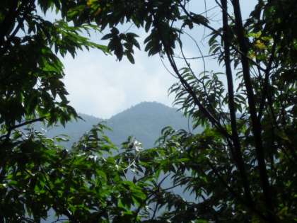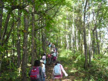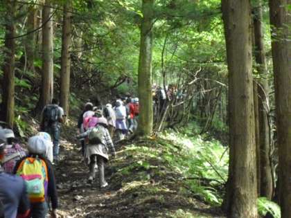 山の中は、昨日の雨のおかげでひんやりとして気持ちよく歩けました。木と木の間から遠くの山々がきれいに見えます。子供たちも苦労しながらも森林浴を楽しみながら頂上へ一歩一歩足を進めました。