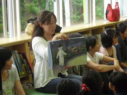 ひとりぼっちのゆきだるまが、まだ見たことのない花を探して旅に出る物語。ちょっとせつなくも、心が温まるお話。DKOの方々のマリンバやパーカッション、コーラスがより一層雰囲気を盛り立ててくれます。絵本の部屋から溢れるくらいに集まった子どもたちも、お話の世界に引きこまれ、誰もが素敵な笑顔を浮かべていました。