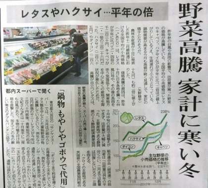 (東京新聞 2018 1/12 野菜高騰 家計に寒い冬 )