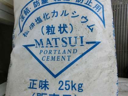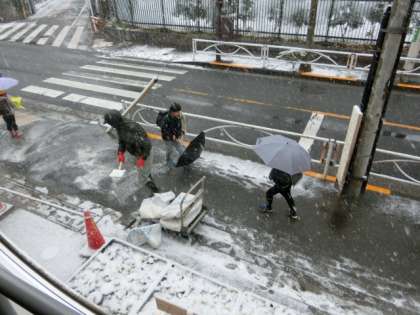 正門前の歩道に、主事さんが凍結防止の塩化カルシウムをまきました。